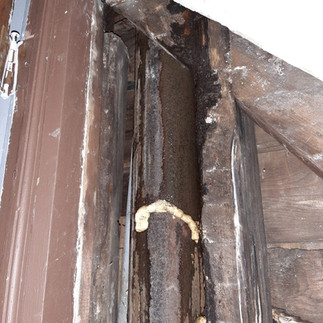 Here are photos of the mold and water damage we found behind the cabinet, on the wall of the basement, inside the ply 'box' the previous owner built, at the sewer line that was in 'the box', and up in the walls behind the kitchen around our main plumbing stack:.